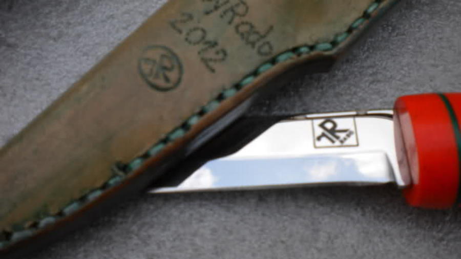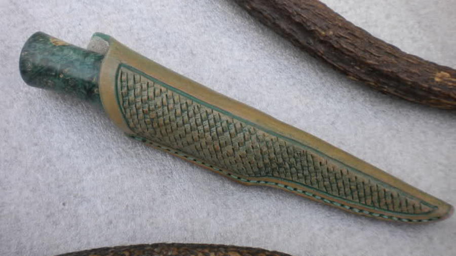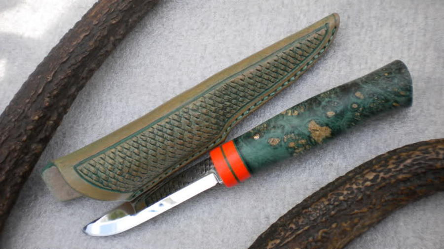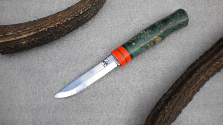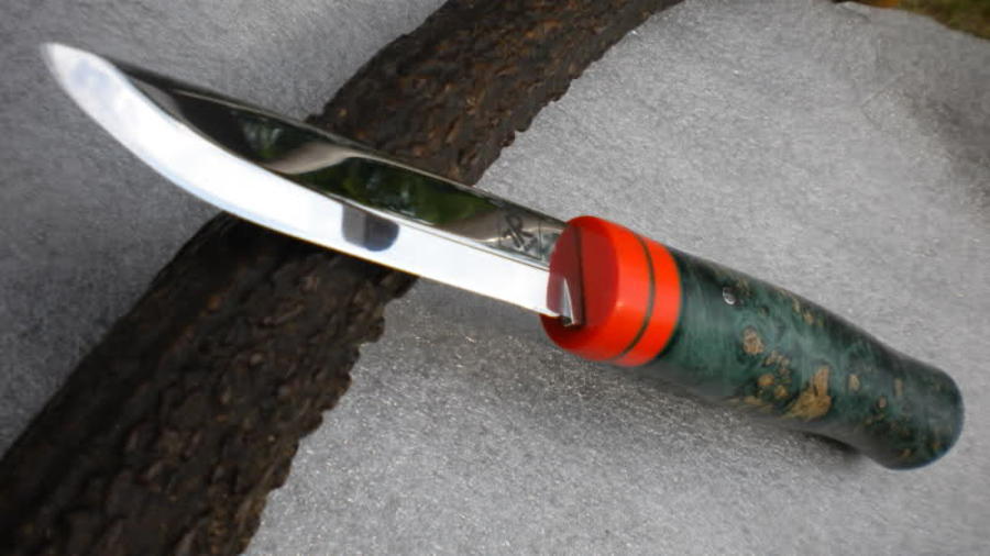 Drška stabilizovano drvo Box Elder, bolster narandžasti G10, zeleni vulkanfiber, ukrasne osovinice (mosaico pins) prečnika 4 mm.