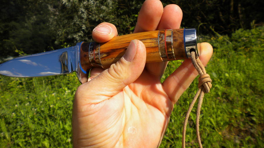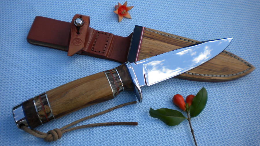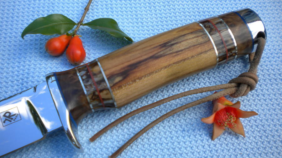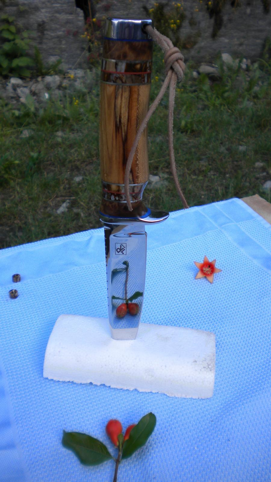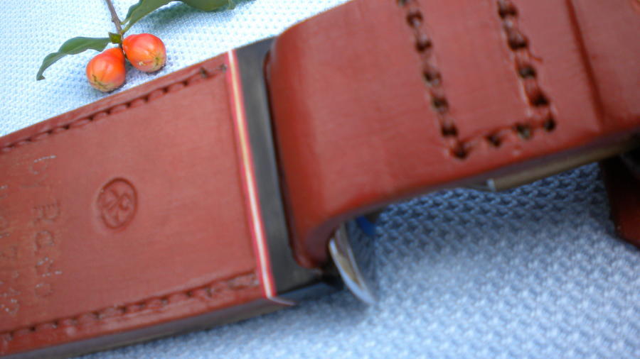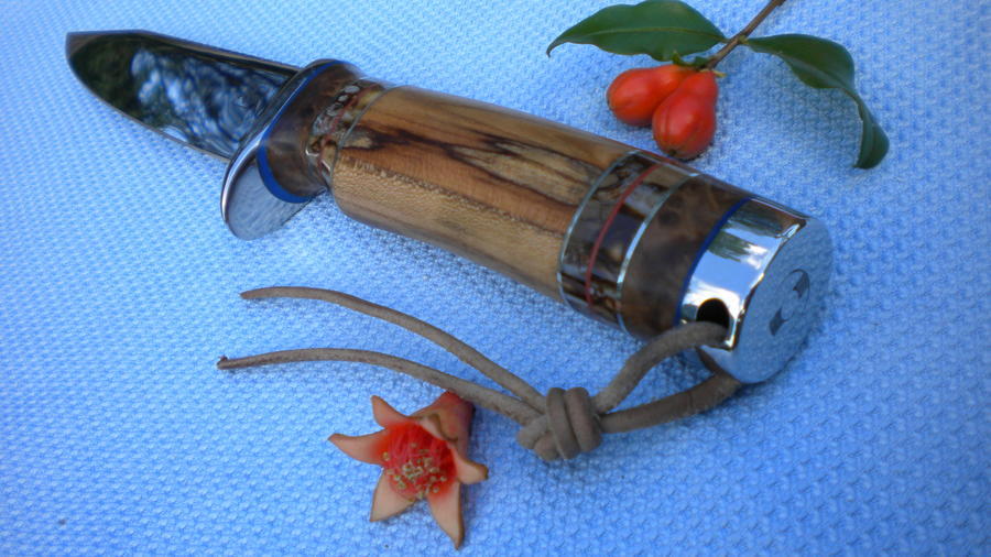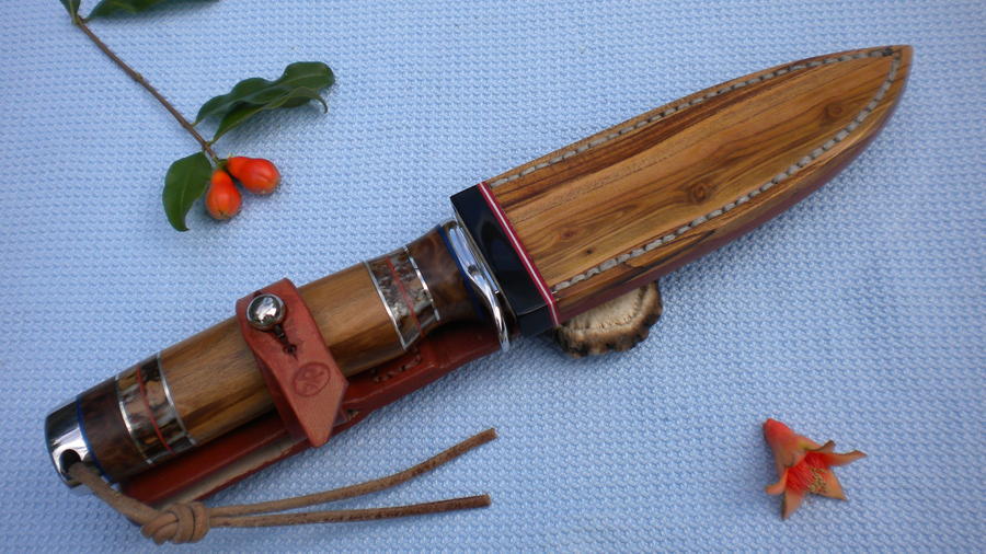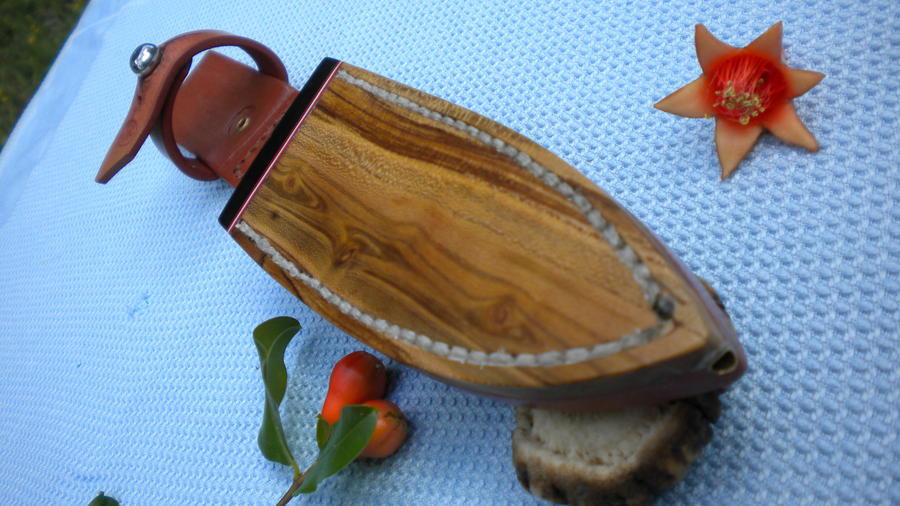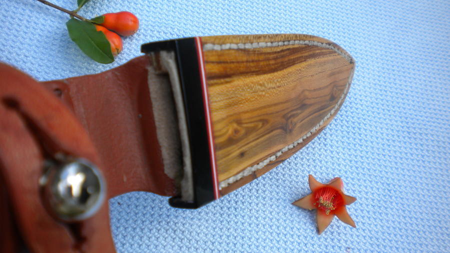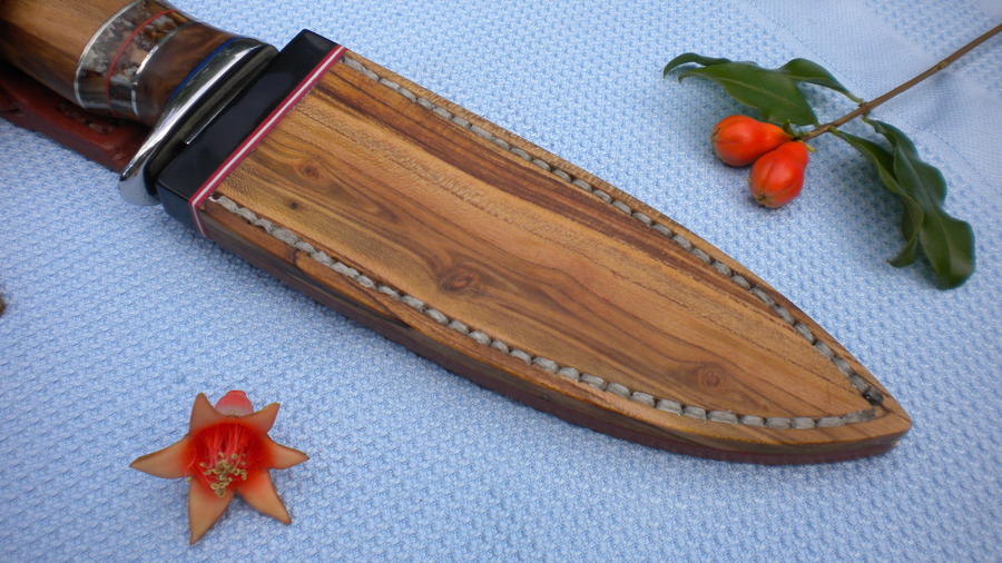 - futrola s prednje strane: stabilizovano drvo od kaisije sa 10% paraloid-om B-72 u acetonu , a druga strana futrole je od biljne štavljane kože i koja je prošivena s voskiranim koncem, na vrhu navučen prsten od crnog roga (bivol) i sa vulkan fiberom; crveni i bijeli.