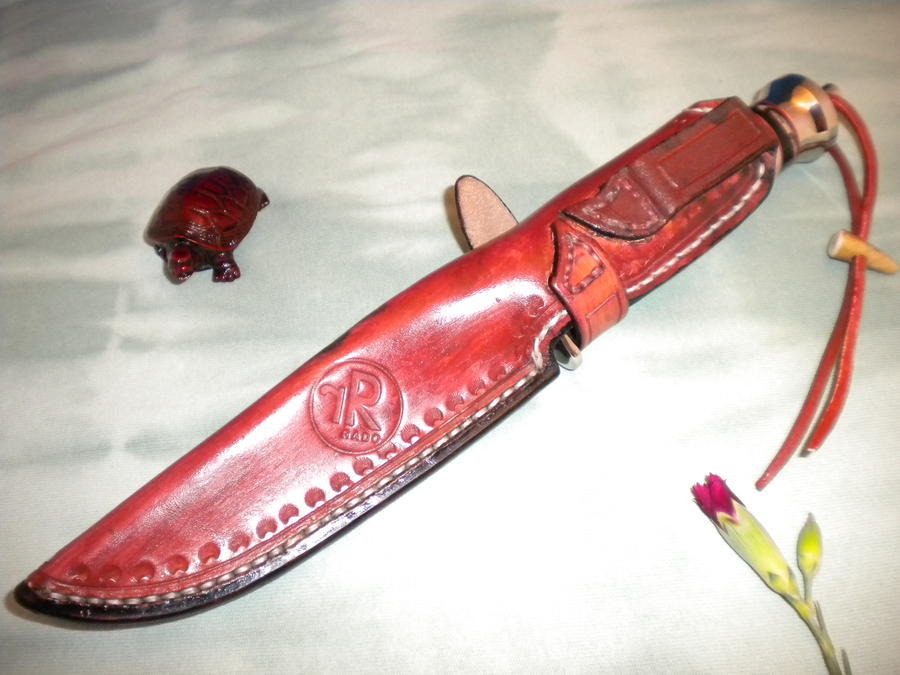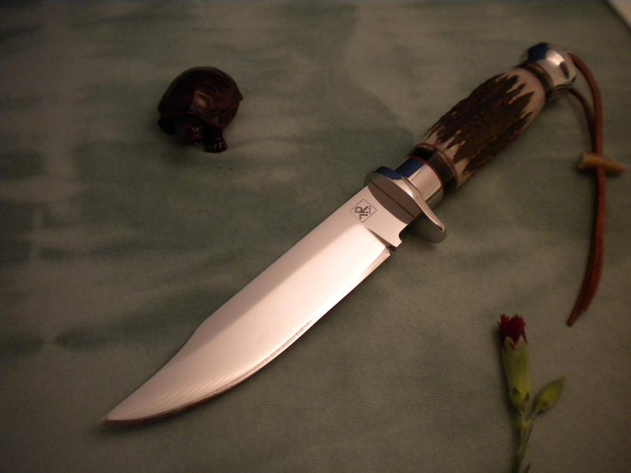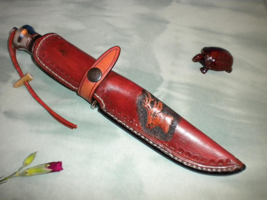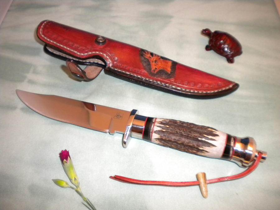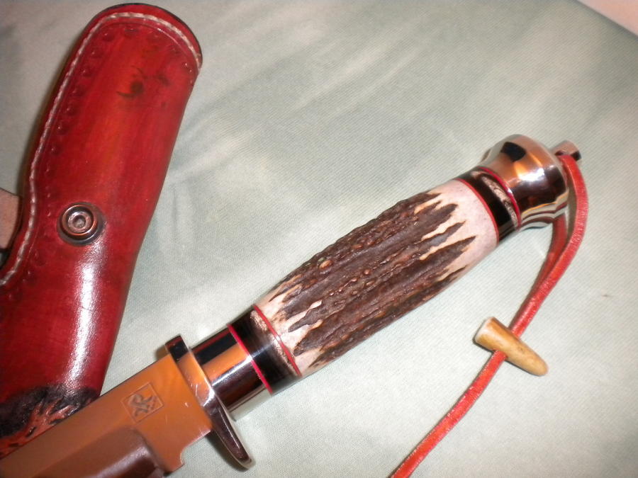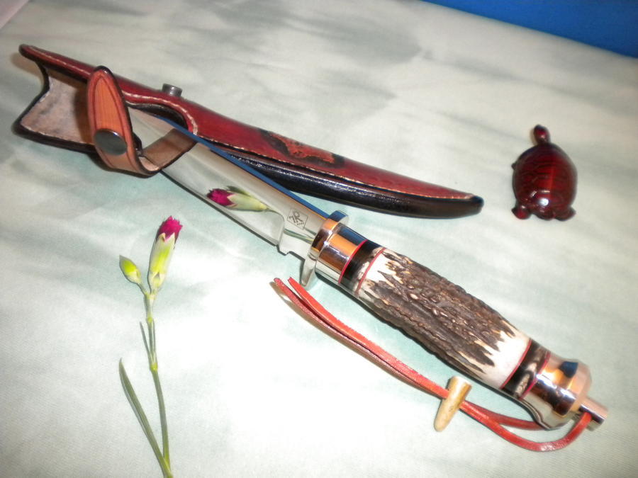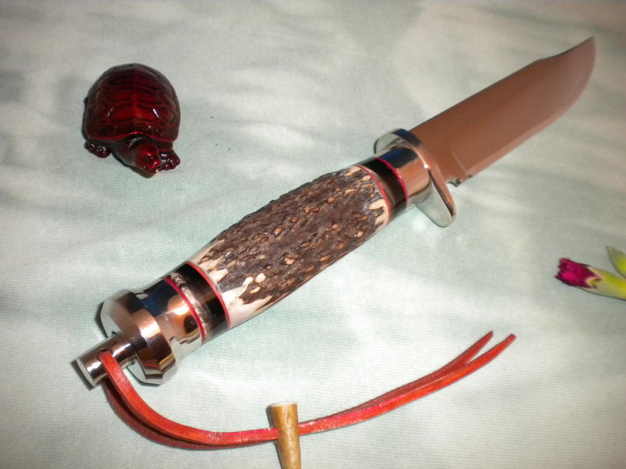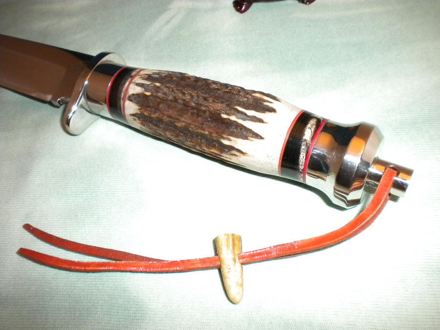 Drška; zaštitnik prsta i jabučice od inox-a, karta vulkanfiber crveni, rog bivola i rog jelena.