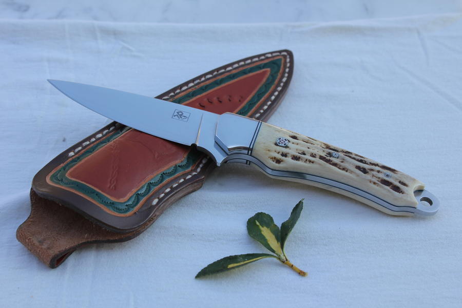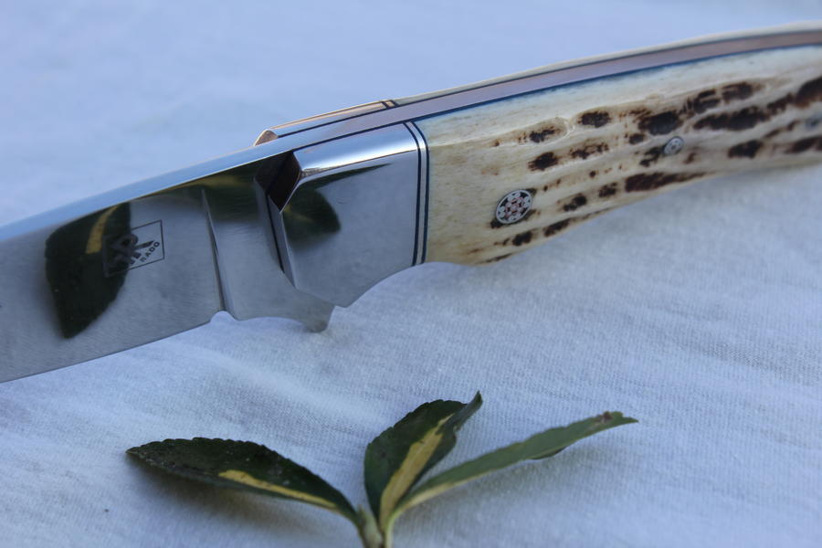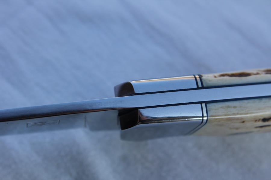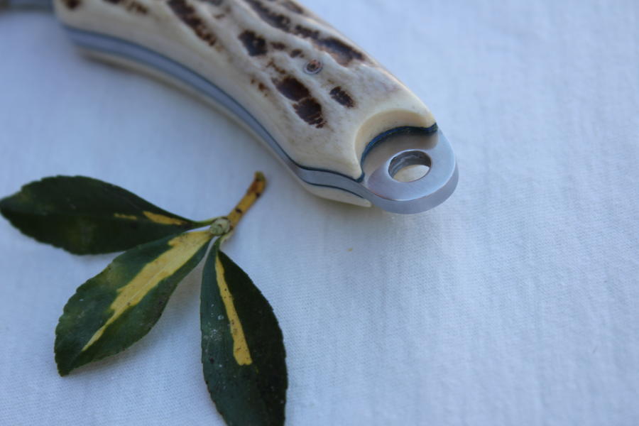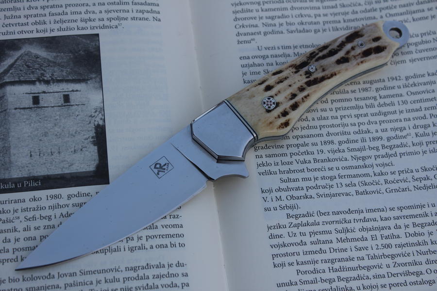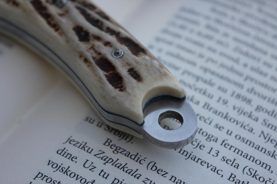 Drška od izrezbarene goveđe kosti, ofarbane /Bone-Scales-Worm Grooved/, sa ukrasnim nitnama i vulkanfiber-om /plavi/.