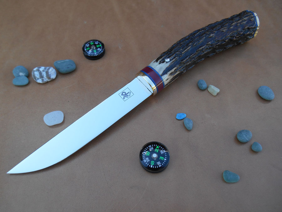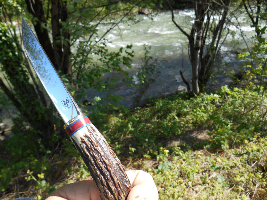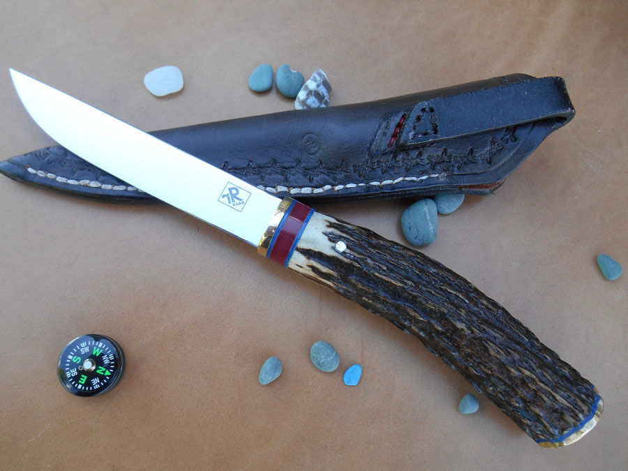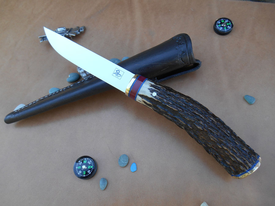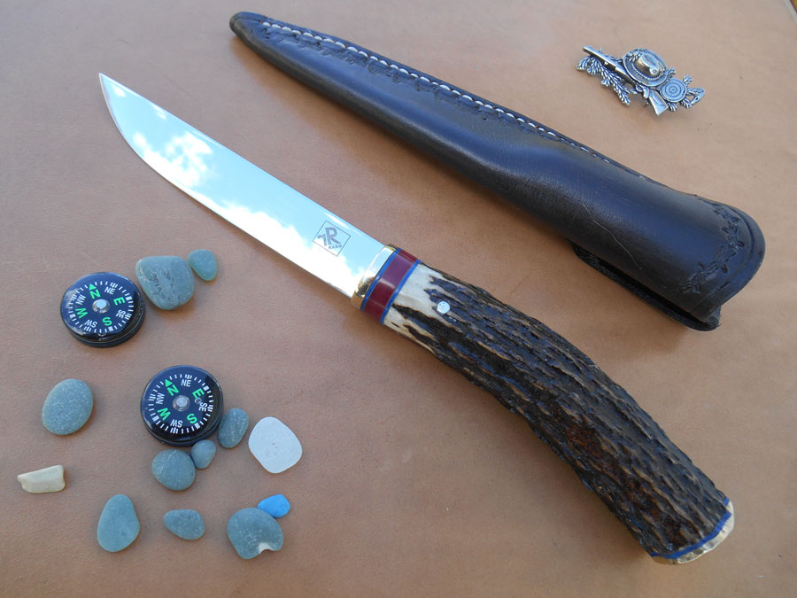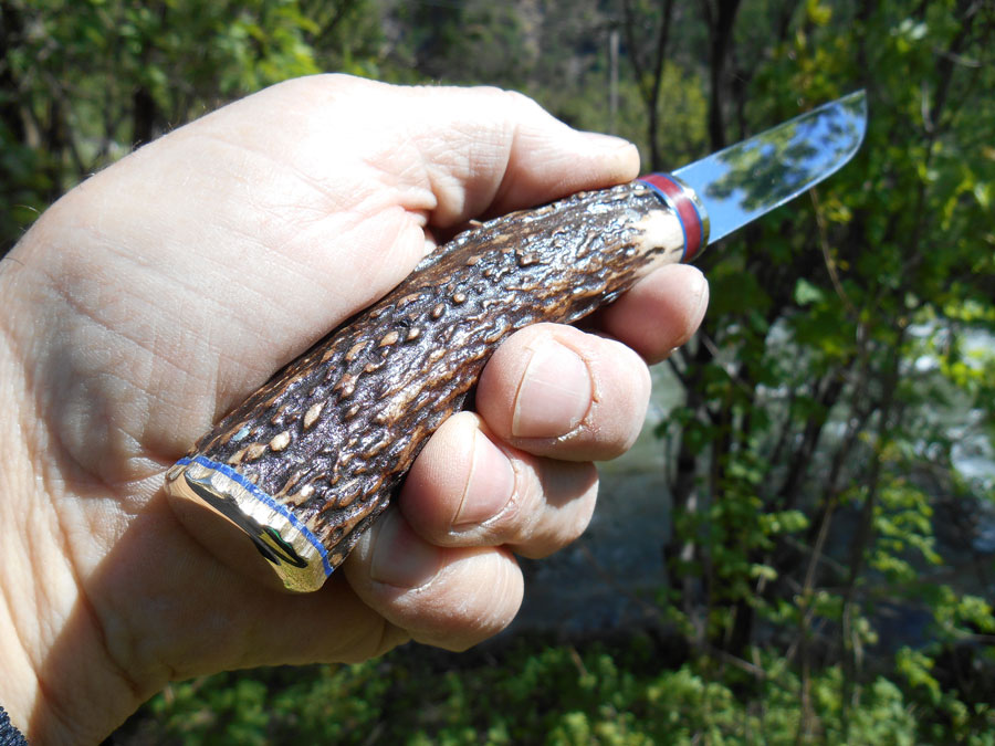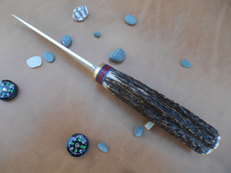 Drška noža od roga jelena, vulkan fibera crveni, plavi i mesinga.