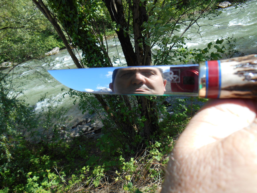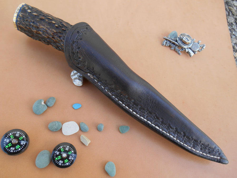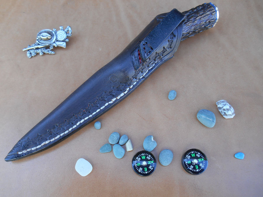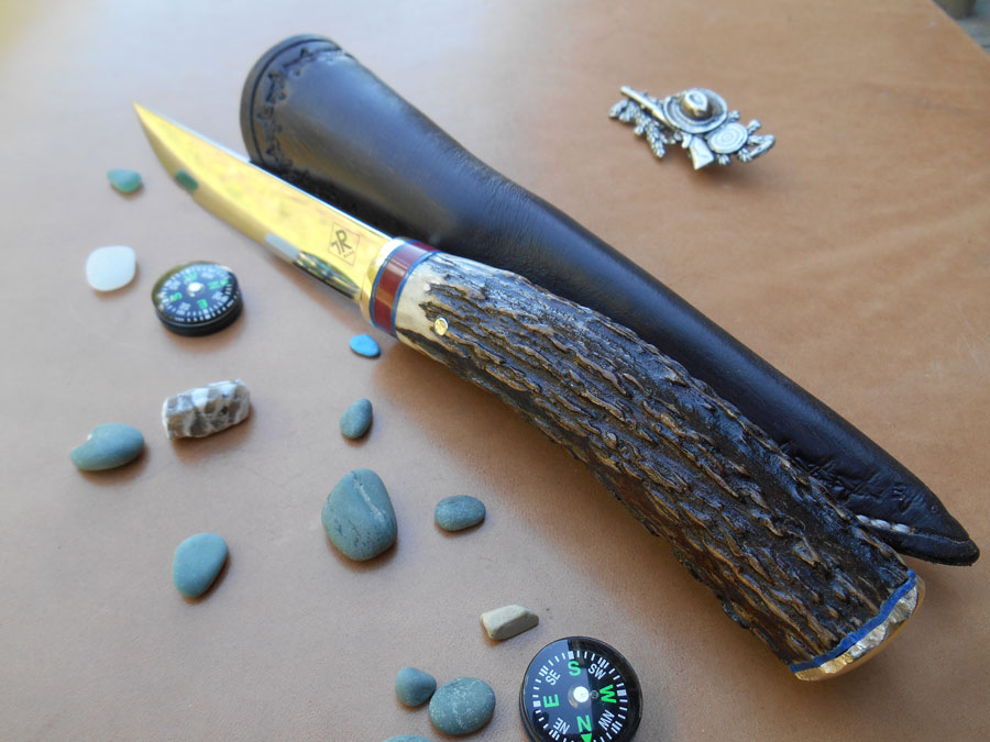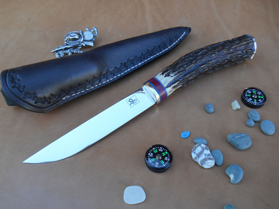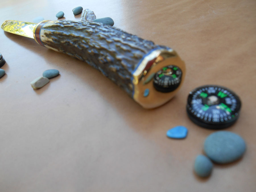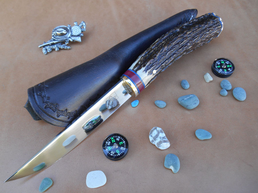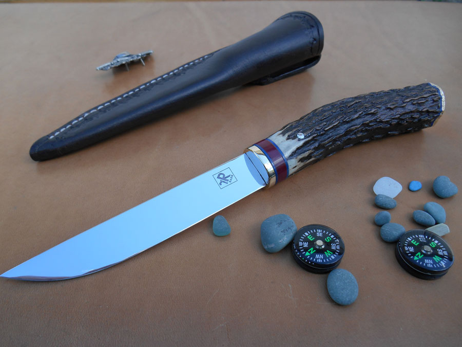 Drška noža od roga jelena, vulkan fibera crveni, plavi i mesinga.