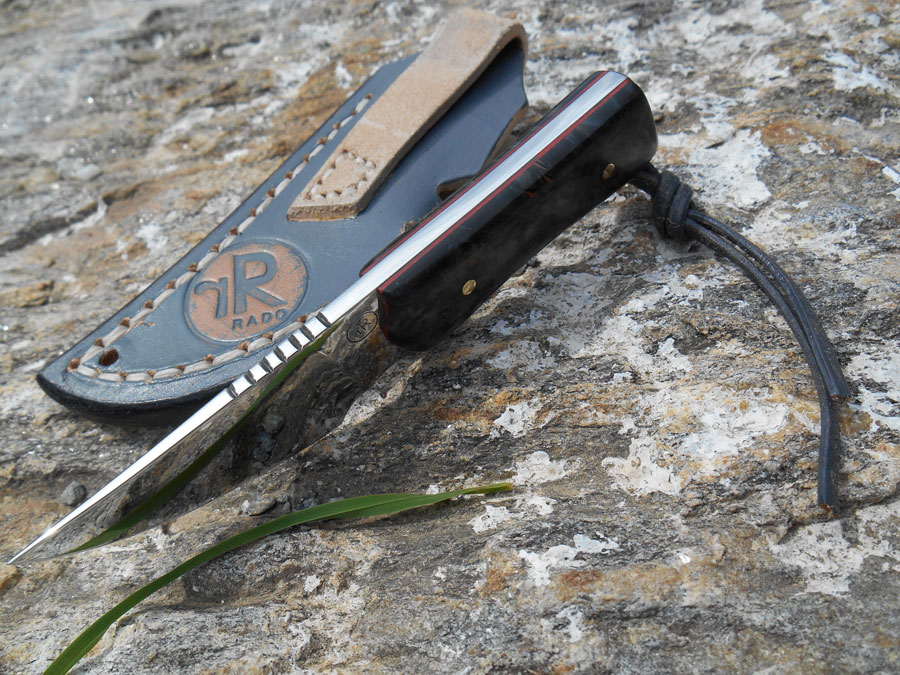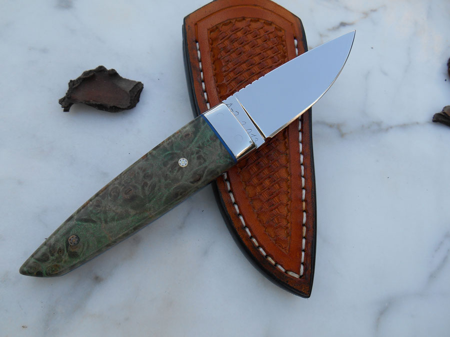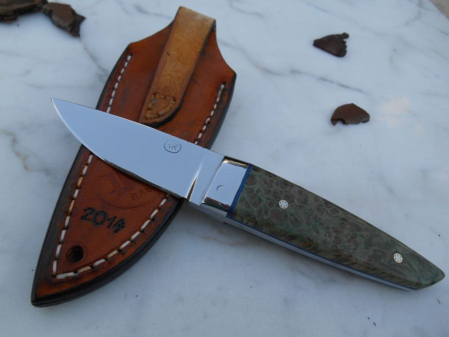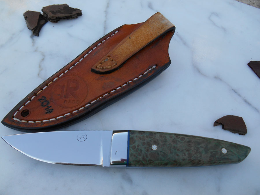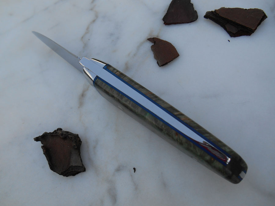 Ukupna duzina 155 mm,duzina sjeciva 68 mm, visina max. 23 mm i debljina max. 4.6 mm.Karbonski celik C70.Drska noza stabilizovano drvo Box Elder , vulkan fiber plavi iUkrasni pin.Futrola rucno radjena od biljno stavljene koze.