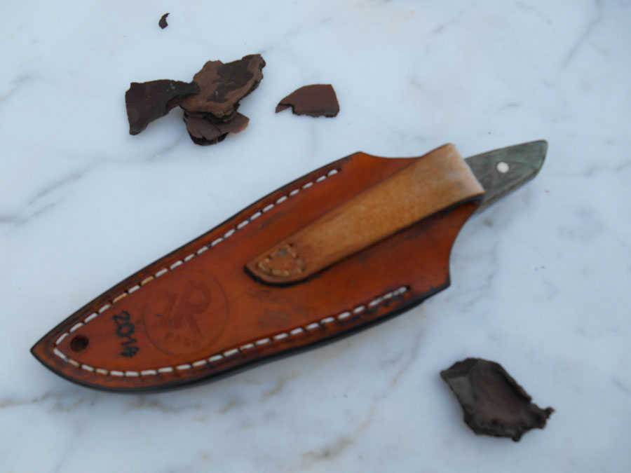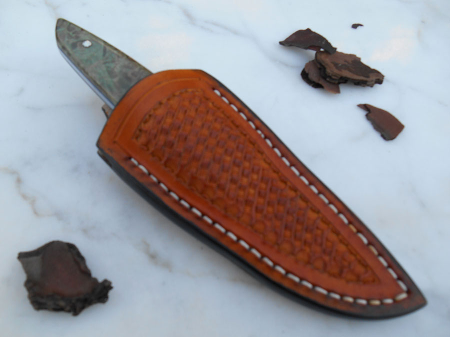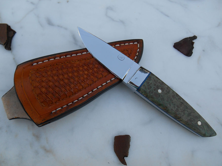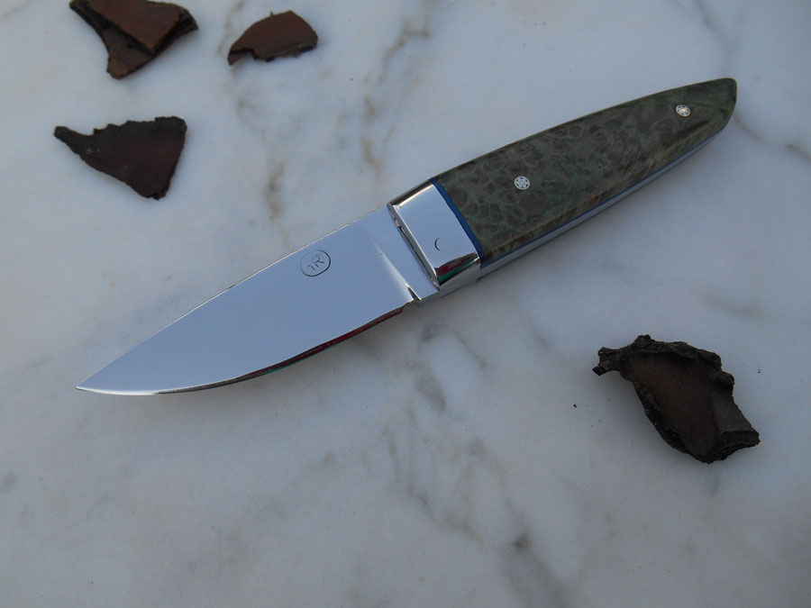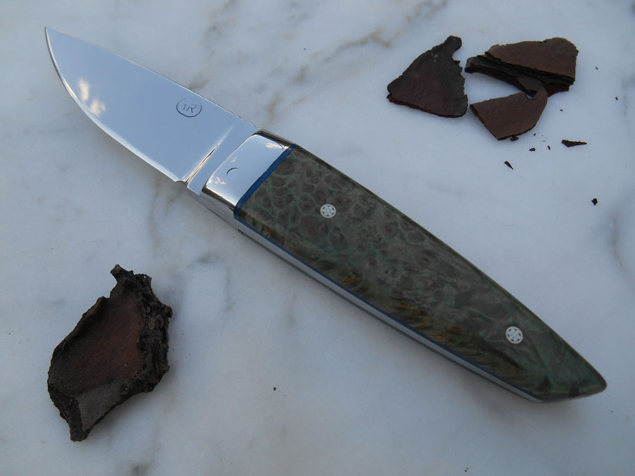 Ukupna duzina 155 mm,duzina sjeciva 68 mm, visina max. 23 mm i debljina max. 4.6 mm.Karbonski celik C70.Drska noza stabilizovano drvo Box Elder , vulkan fiber plavi iUkrasni pin.Futrola rucno radjena od biljno stavljene koze.